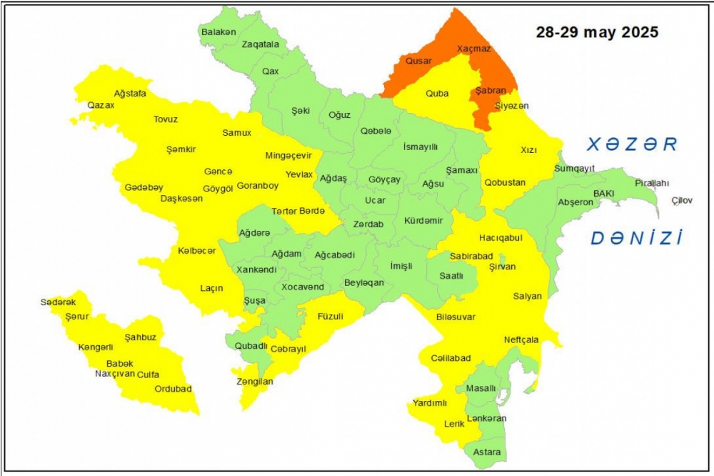 Mayın 28-29-da bəzi bölgələrdə gözlənilən küləkli hava şəraiti ilə bağlı sarı və narıncı xəbərdarlıq verilib.