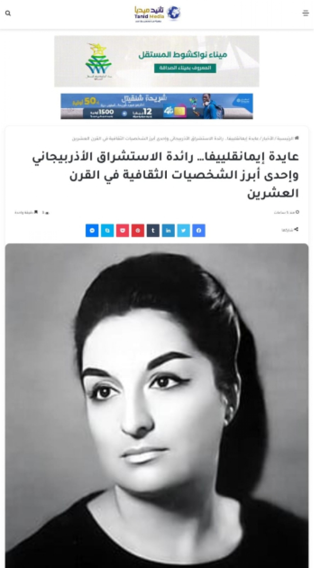 Əlcəzairin “Əl Hərir”, Tunisin “Shams-alyaoum”, Mavritaniyanın “tanidmedia.net” və “elmouritany.info” xəbər portallarında “Aida İmanquliyeva – Azərbaycan şərqşünaslığının qabaqcıl nümayəndəsi və XX əsrin görkəmli mədəniyyət xadimlərindən biridir” sərlövhəli məqalə yayımlanıb.