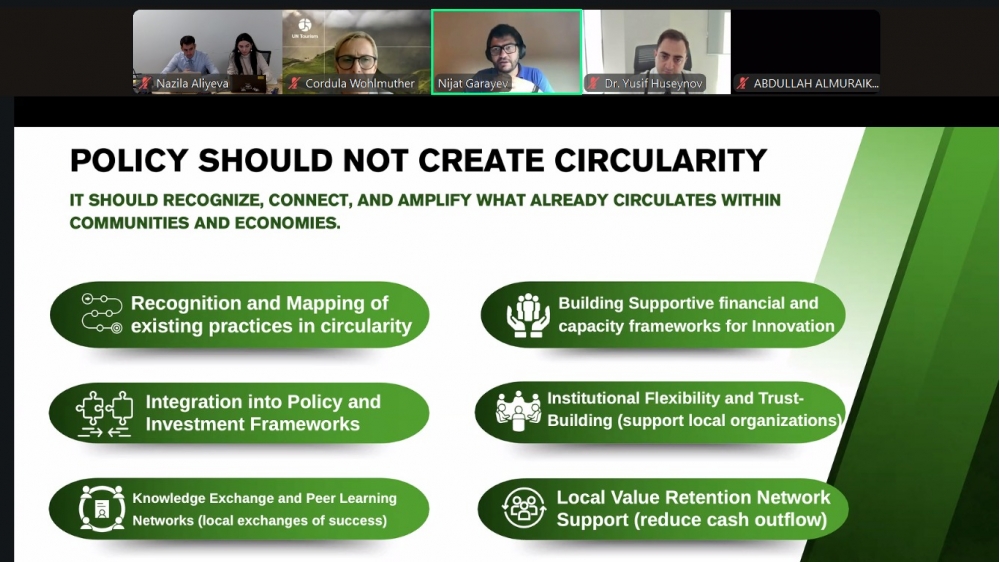 Tədbirin birinci sessiyası “Dairəvi İqtisadiyyat və Turizm – Dayanıqlı İnkişaf üçün Çərçivə” mövzusuna həsr olunub. Sessiyada BMT-nin Ümumdünya Turizm Təşkilatının Avropa üzrə regional direktoru Kordula Volmuther, W.M.A.S. Vikramasinghe və müstəqil ekspert, inkişaf iqtisadçısı Nicat Qarayev çıxış edərək dairəvi turizmin praktik tətbiqləri və region ölkələri üçün potensial imkanlarını müzakirə ediblər.