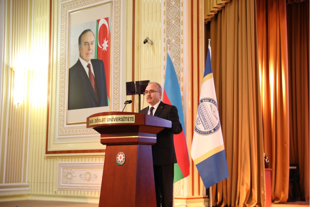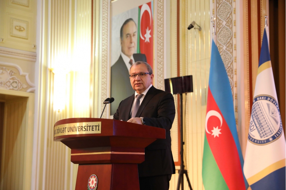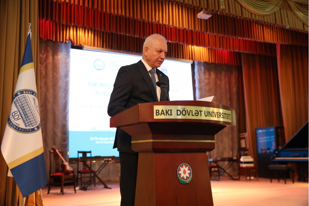 Mərasimdə çıxış edən BDU rektoru Elçin Babayev bildirib ki, XXI əsr bəşəriyyət üçün yeni bir dönüş nöqtəsidir. Texnologiyalar inkişaf etdikcə, süni intellekt sistemləri insan düşüncəsinin sərhədlərini aşır. Lakin bu texnologiyanın real gücü onun etika ilə tamamlandığı, insan yönümlü və məsuliyyətli şəkildə tətbiq edildiyi zaman ortaya çıxır. Bu baxımdan süni intellektin etik ölçülərini müzakirə etmək təkcə elmi məsələ deyil, həm də mənəvi və milli məsuliyyətdir. Prezident İlham Əliyev tərəfindən imzalanmış “Azərbaycan Respublikasının 2025-2028-ci illər üçün Süni İntellekt Strategiyası” ölkəmizin gələcək inkişafının əsas istiqamətlərini müəyyənləşdirir. Bu strateji sənəddə süni intellektin “etik dəyərlər çərçivəsində və məsuliyyətlə istifadəsi”, “insan yönümlü yanaşma, şəffaflıq, ədalət və etibarlılıq” kimi prinsiplər dövlət siyasətinin ayrılmaz hissəsi kimi təsbit olunub: “Azərbaycan bu sahədə regionda nümunə yaratmaq əzmindədir. Bakı Dövlət Universiteti isə bir əsrdən çox tarixə malik, elmi və mənəvi düşüncənin beşiyi olaraq süni intellektin etik və elmi tərəflərinin araşdırılmasına xüsusi diqqət yetirir. Son illərdə Universitetdə bu istiqamətdə mühüm addımlar atılıb. Beynəlxalq Türk Akademiyası ilə birlikdə “Süni intellektin etikası” kafedrası təsis edilib və onun tərkibi formalaşdırılmaqdadır. Bu kafedra süni intellektin istifadəsi zamanı etik, hüquqi, sosial və digər məsuliyyət tərəflərini də öyrədir. Beynəlxalq əməkdaşlıq çərçivəsində Türkiyə, Qazaxıstan, Özbəkistan və digər ölkələrin universitetləri ilə birgə etik və hüquqi tədqiqat layihələrinin reallaşdırılması nəzərdə tutulur. Bu gün BDU-nun qarşısında bu sahədə duran əsas vəzifə yalnız süni intellekt sistemləri yaratmaq deyil, insana xidmət edən, ədalət və etika prinsipləri ilə tənzimlənən elmi mədəniyyət formalaşdırmaqdır”.