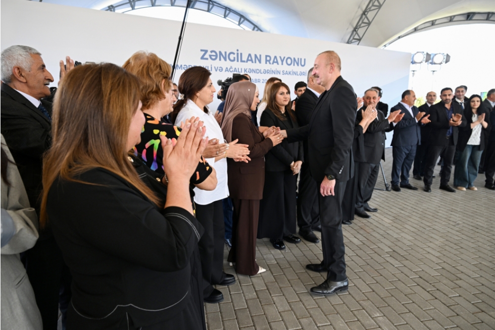 Prezident İlham Əliyev: Uzun illər ərzində ağır şəraitdə yaşamısınız. Köçkün həyatı çox ağır həyatdır. Ancaq artıq o günlər arxada qaldı. Beş ilə yaxındır ki, Azərbaycan öz ərazi bütövlüyünü bərpa edib və azad olunmuş bütün torpaqlarda geniş quruculuq işləri gedir, o cümlədən Zəngilan rayonunda. Yenə də deyirəm, birinci “Böyük Qayıdış” Proqramını biz Zəngilan rayonundan başlamışdıq. Bu gün Zəngilan şəhərində də birinci yaşayış kompleksinin tikintisi demək olar ki, yekunlaşır. Digər binaların tikintisi, məktəb, xəstəxana. Zəngilan məscidi tikilmişdir, gözəl bir memarlıq əsəridir. Konqres Mərkəzi, Zəngilan Beynəlxalq Hava Limanı. Yəni, bura, bu bölgə çox önəmli nəqliyyat mərkəzlərindən birinə çevriləcək. Həm Zəngəzur dəhlizi, həm Araz dəhlizi buradan keçəcək. Ona görə bu rayonun, bu bölgənin çox gözəl gələcəyi olacaq. Necə ki, bütün Qarabağın, Şərqi Zəngəzurun gələcəyi çox parlaq olacaq. Bugünkü reallıq - qurduğumuz şəhərlər və kəndlər bunu göstərir.