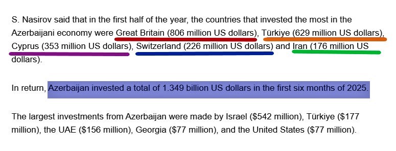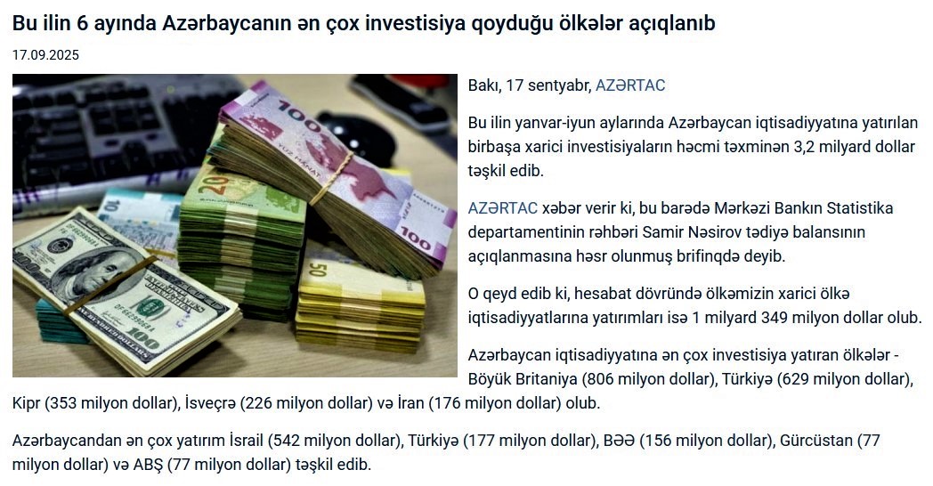 MB-nın Statistika departamentinin rəhbəri tərəfindən açıqlanan məlumata əsasən, 2025-ci ilin yanvar-iyun aylarında Azərbaycan iqtisadiyyatına yatırılan birbaşa xarici investisiyaların həcmi təxminən 3,2 milyard dollar təşkil edib. Azərbaycan iqtisadiyyatına ən çox investisiya yatıran ölkələr - Böyük Britaniya (806 milyon dollar), Türkiyə (629 milyon dollar), Kipr (353 milyon dollar), İsveçrə (226 milyon dollar) və İran (176 milyon dollar) olub. Azertag