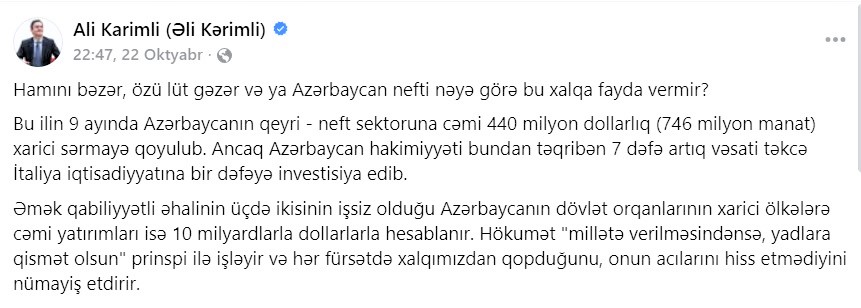 “Bu ilin 9 ayında Azərbaycanın qeyri-neft sektoruna cəmi 440 milyon dollarlıq (746 milyon manat) xarici sərmayə qoyulub. Ancaq Azərbaycan hakimiyyəti bundan təqribən yeddi dəfə artıq vəsaiti təkcə İtaliya iqtisadiyyatına bir dəfəyə investisiya edib. Əmək qabiliyyətli əhalinin üçdə ikisinin işsiz olduğu Azərbaycanın dövlət orqanlarının xarici ölkələrə cəmi yatırımları isə 10 milyardlarla dollarlarla hesablanır”, – deyə paylaşımda qeyd olunub.