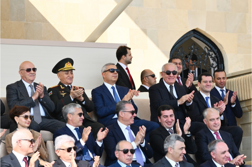 “İki sahil” xəbər verir ki, Azərbaycan Respublikasının Prezidenti İlham Əliyev, birinci xanım Mehriban Əliyeva, Türkiyə Respublikasının Prezidenti Rəcəb Tayyib Ərdoğan, Pakistan İslam Respublikasının Baş naziri Məhəmməd Şahbaz Şərif paradda iştirak ediblər.
