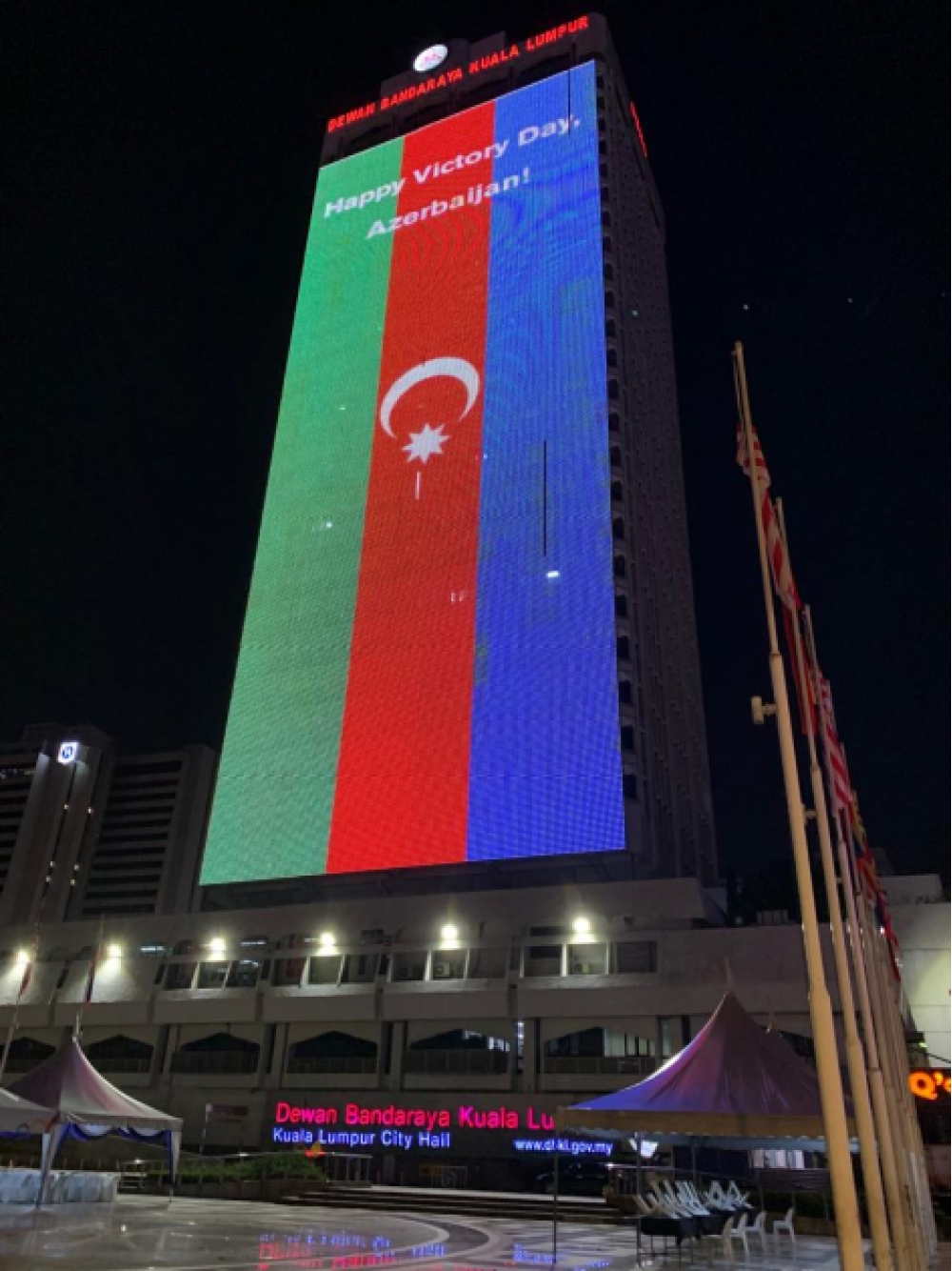 “İki sahil” xəbər verir ki, Kuala-Lumpur şəhər bələdiyyəsinin inzibati binasının möhtəşəm “MENARA-1” qülləsi üzərindəki rəqəmsal ekranda nəhəng Azərbaycan bayrağı proyeksiya edilib. Şanlı üçrəngli bayrağımızın fonunda “Zəfər Günün mübarək, Azərbaycan” sözləri yazılıb.