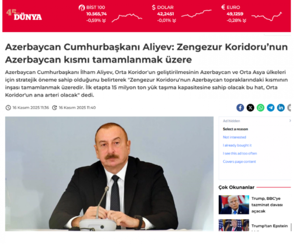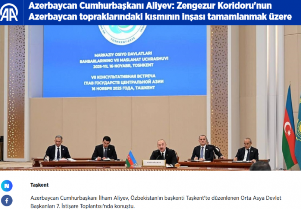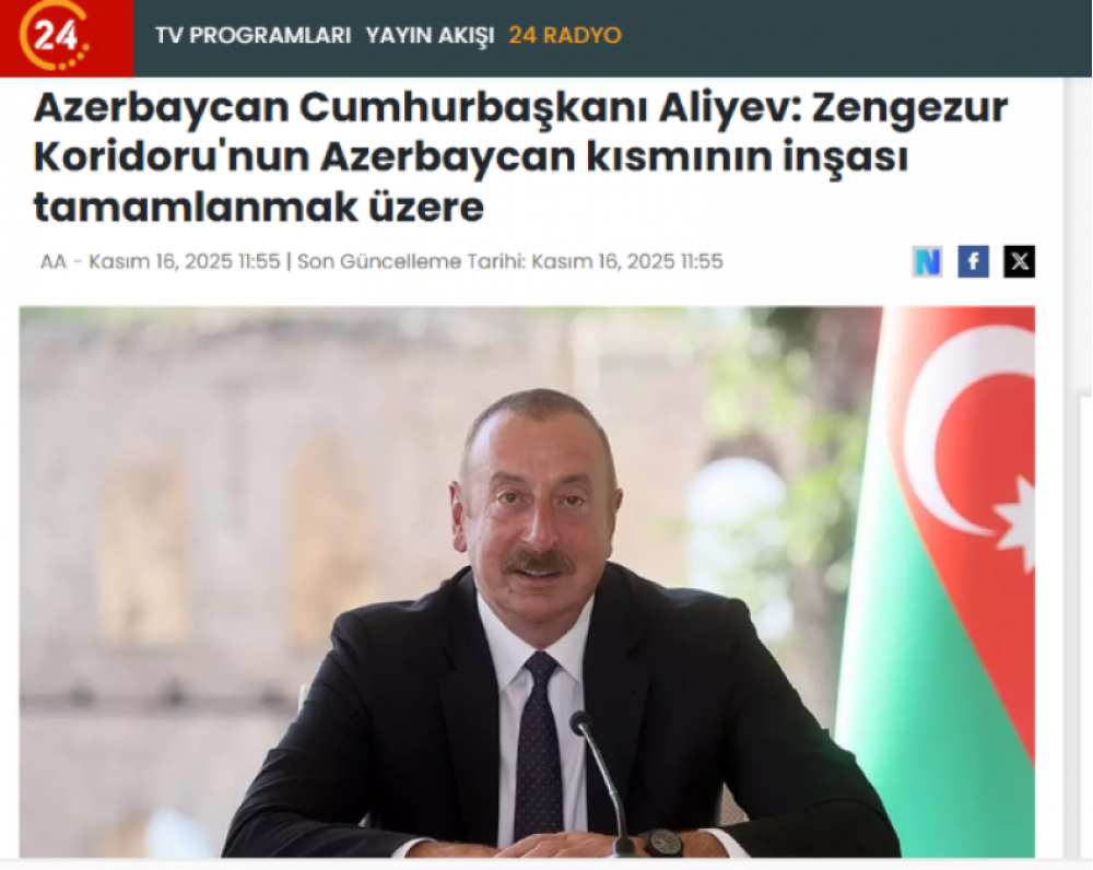 “İki sahil” xəbər verir ki, qardaş ölkənin media orqanları bazar günü yayımlanan reportajlarında Azərbaycan liderinin görüş iştirakçılarına müraciətinə, o cümlədən Zəngəzur dəhlizi layihəsi (Beynəlxalq Sülh və Rifah naminə Tramp Marşrutu, TRIPP) ilə bağlı fikirlərinə diqqət yetiriblər.