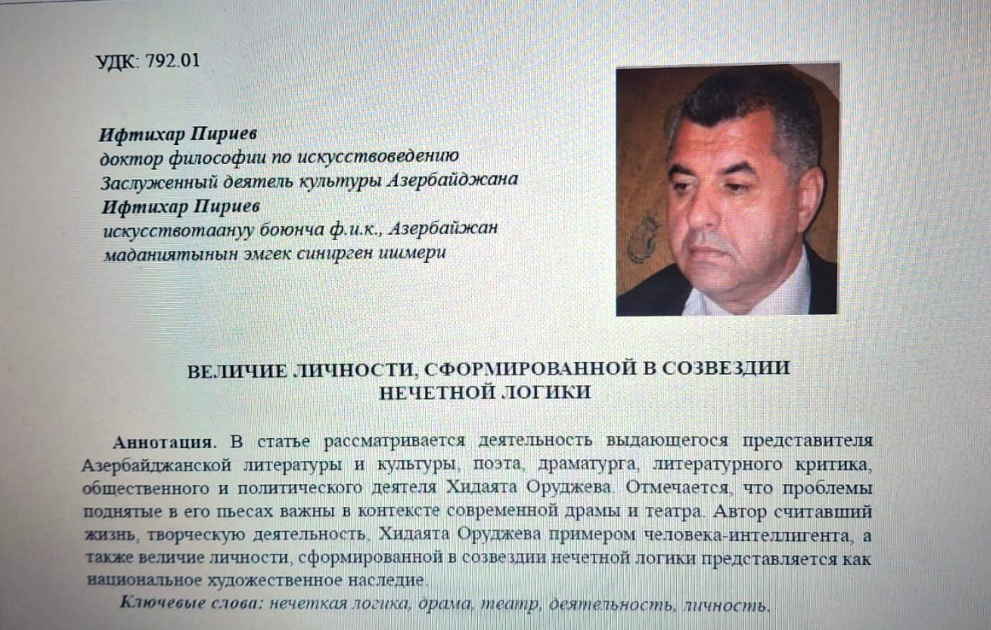 “İki sahil” xəbər verir ki, "Qeyri-səlis məntiq kəhkəşanında kamilləşən şəxsiyyətin ucalığı" adlı məqalə əvvəlcə Qırğızıstan Milli Elmlər Akademiyasının "Xəbərlər" jurnalında çap olunub. Məqalədə Hidayət Orucovun dramaturgiyasının ötən əsrin ikinci yarısı və XXI əsrin əvvəllərində milli teatr hərəkatının inkişafındakı rolu vurğulanır.