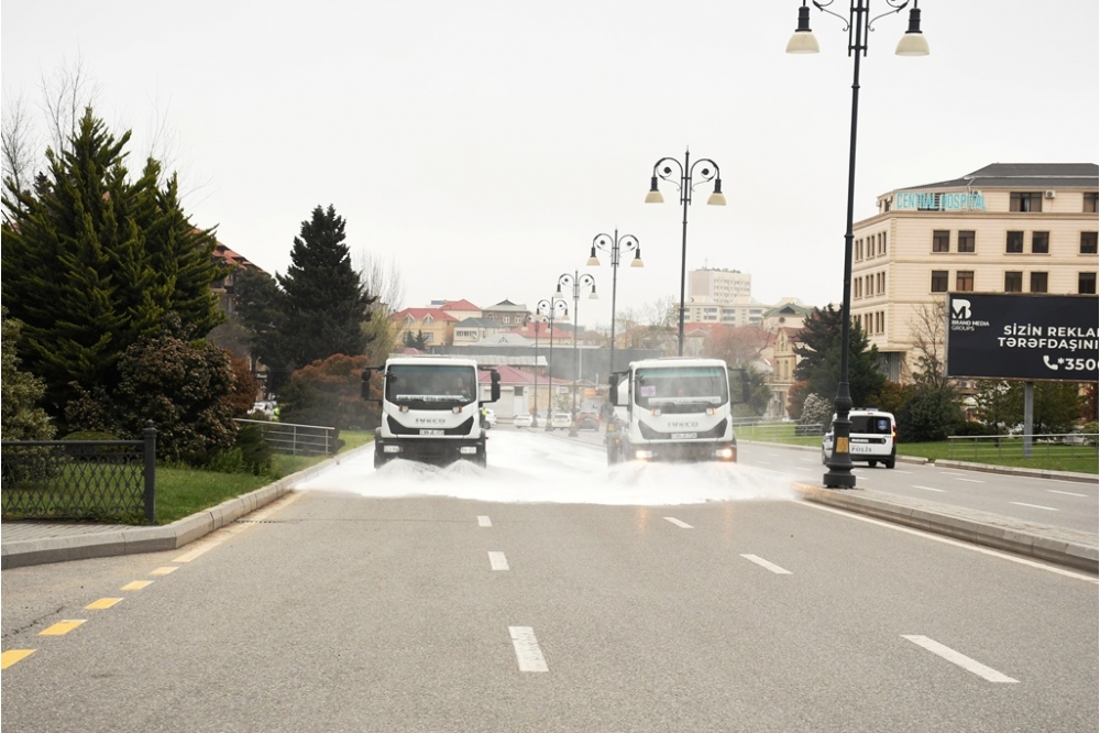 Bakı Şəhər İcra Hakimiyyətinin Mətbuat Xidmətindən “İki sahil”ə verilən məlumata görə, səhər saatlarından Bakı Şəhər İcra Hakimiyyəti Kommunal təsərrüfat xidmətlərinin texnikası bitki və canlılara zərər verməyən yuyucu maddələrlə əsas küçə və prospektlərin yuyulmasını aparıb. Bu zaman həm də məhəllədaxili və ara yollar da yuyulub.
