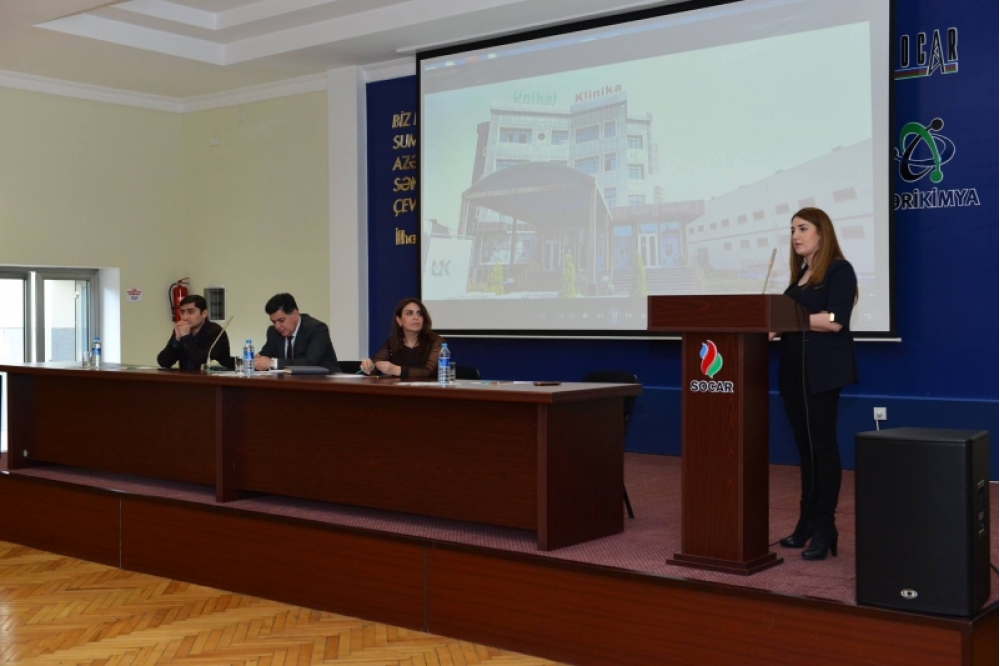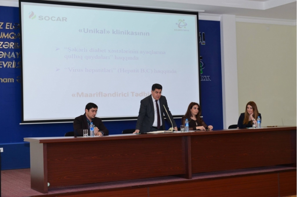 SOCAR-ın «Azərikimya» İstehsalat Birliyində şəkərli diabet və virus hepatitləri mövzusunda tibbi-maarifləndirici tədbir keçirilmişdir.Tədbirdə Sumqayıt şəhərində yerləşən “Unikal” klinikasının həkimləri “Virus hepatitlərinin yaranma yolları”, “Hepatitli xəstələrə və ailələrə psixoloji yanaşma”, həmçinin “Şəkərli diabet xəstəliyinin yaranma səbəbləri və bu qəbildən olan xəstələrə qulluq” mövzusunda kimyaçılar qarşısında təqdimatla çıxış etmişlər. Görüşdə kimyaçıların çoxsaylı sualları həkimlər tərəfindən cavablandırılmışdır.