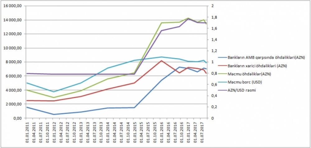 Analitik qrup bildirir ki, bank sektorunun borclarının azalmasına səbəb xarici borcların effektivliyini itirməsi və müddətlərinin başa çatması səbəbindən qapadılmasıdır. İqtisadiyyata kredit qoyuluşlarının həcmində son 2 ildə davam edən azalma və kreditləşmə şərtlərinin sərtləşdirilməsi bankların əlavə vəsait ehtiyacını azaldıb. Belə ki, 2015-ci ilin dekabr ayında baş verən 2-ci devalvasiyadan sonra 24 627,2 mlrd. manata çatan kredit portfelinin həcmi 2,1 dəfə azalaraq 2017-ci il sentyabrın 1-nə 11 728,8 mlrd. manat təşkil edib. Bankların öhdəliklərini azaltmasına təsir edən başqa bir səbəb də problemli kreditlərin həcminin azalması fonunda bankların müvafiq ehtiyat ayırmalarından azad olunaraq əlavə likvid vəsait yaratması ilə bağlıdır.