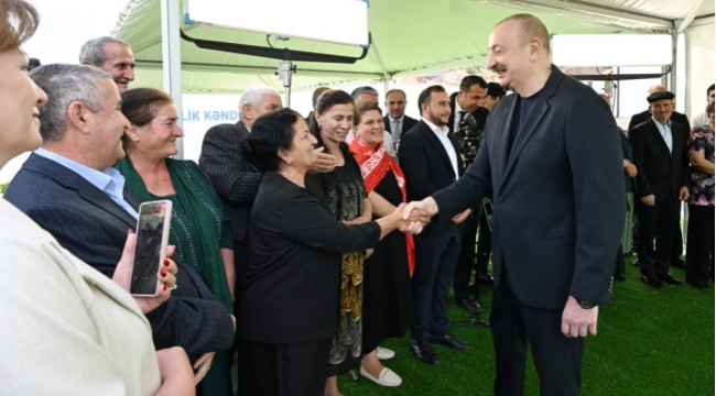Prezident İlham Əliyev Laçının Bəylik kəndinə köçən sakinlərlə görüşüb, onlara evlərin açarlarını təqdim edib -