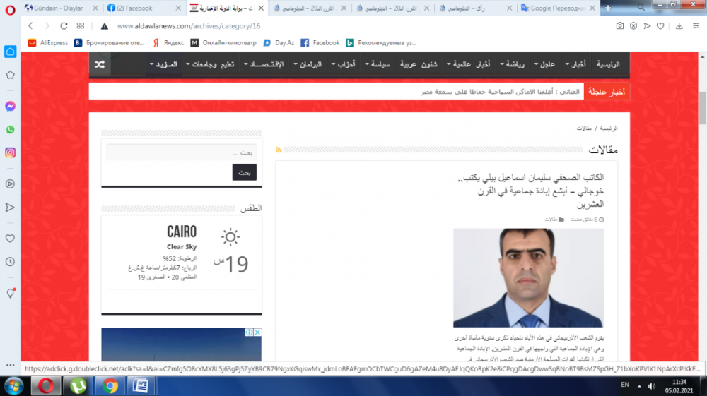 “İki sahil” xəbər verir ki, müəllifin bu dəfəki yazısı 29 il əvvəl ermənilərin Xocalıda törətdikləri soyqırıma həsr olunub. "Xocalı-XX əsrin ən dəhşətli soyqırımı" adlı məqalə Misirin məşhur aldiplomasy.com, aldawlanews.com, eləcə də İordaniyanın nayrouz.com saytlarında dərc edilib. Müəllif məqalədə ermənilərin 29 il əvvəl, fevralın 25-dən 26-na keçən gecə Xocalıda törətdikləri vəhşiliklərdən yazır. Bildirir ki, insanlıq əleyhinə yönəlmiş bu soyqırım zamanı 613 mülki vətəndaş ermənilər tərəfindən vəhşicəsinə qətlə yetirildi ki, onlardan da 63-ü uşaq, 106-sı qadın, 70-i isə qoca və ahıl şəxslər idi. Həmçinin 8 ailə erməni vəhşiliyinin qurbanı olaraq tamamilə məhv edildi, 25 uşaq hər iki valideynini, 130 uşaq isə valideynlərindən birini itirdi. Xocalı soyqırımı zamanı vəhşicəsinə qətlə yetirilənlərlə yanaşı 76-sı uşaq olmaqla, 487 nəfər düşmən gülləsinə tuş gələrək yaralandı.