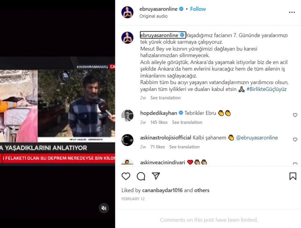 Kahramanmaraşda dağıntılar altında qalan qızının əlini buraxmayan Mesut Hançeri adlı şəxsə türkiyəli müğənni Ebru Yaşar yardım edib.