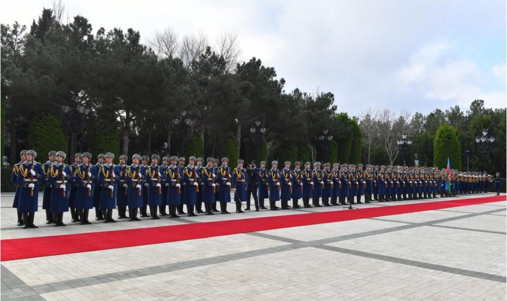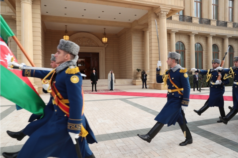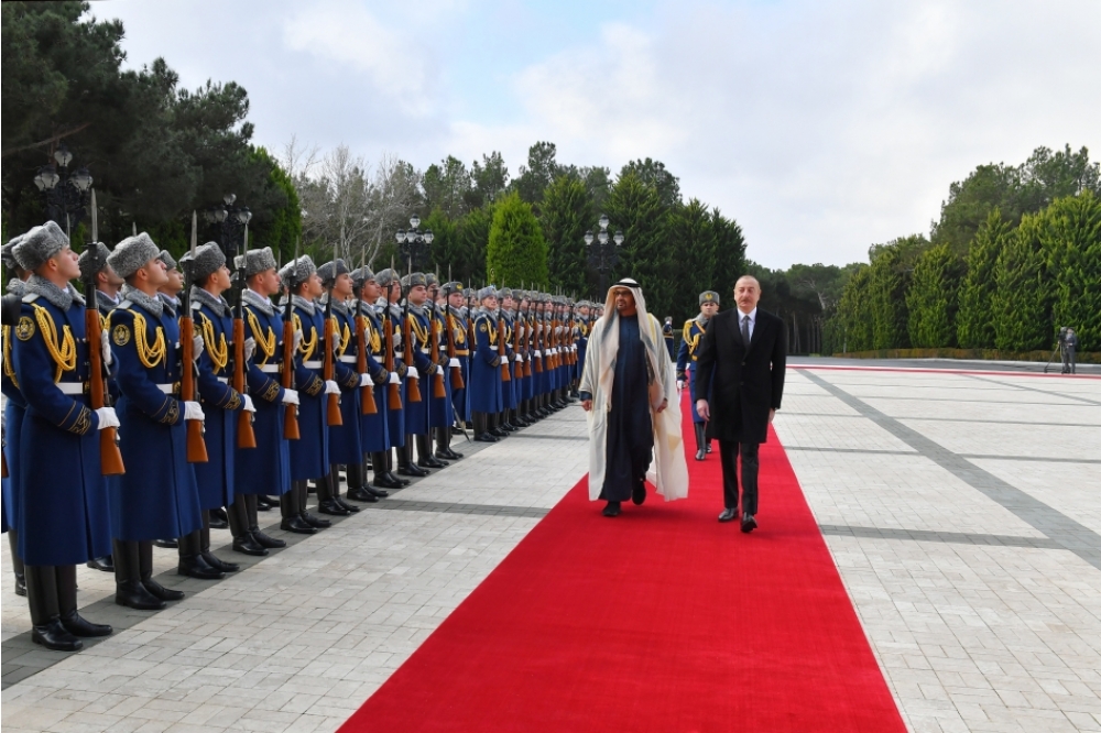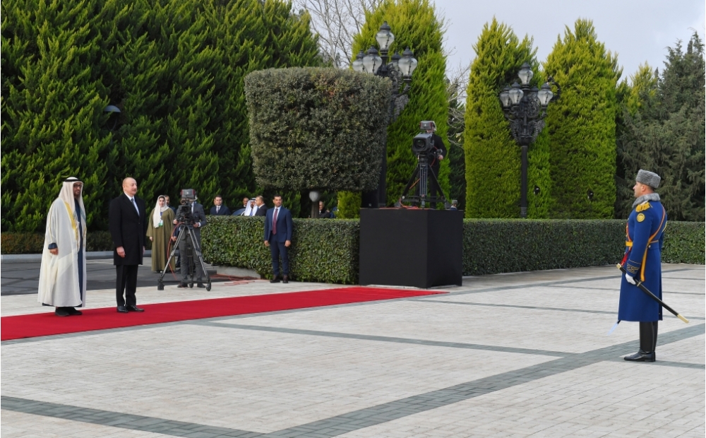 Fəxri qarovul dəstəsi hərbi marşın sədaları altında Azərbaycan Prezidenti İlham Əliyevin və Birləşmiş Ərəb Əmirliklərinin Prezidenti Şeyx Məhəmməd bin Zayed Əl Nəhyanın qarşısından keçdi.