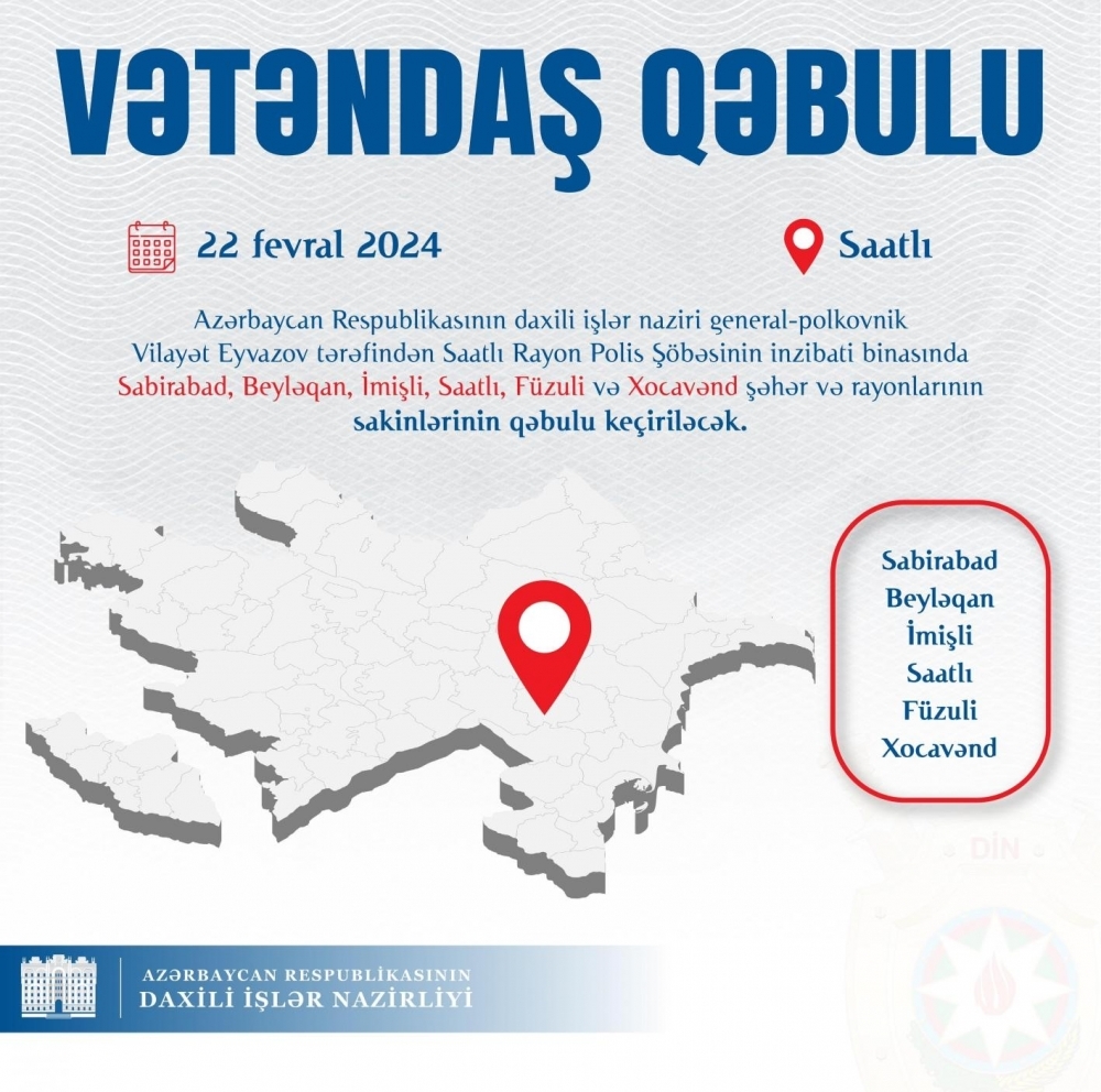 Daxili işlər naziri general-polkovnik Vilayət Eyvazov fevralın 22-də Saatlı Rayon Polis Şöbəsinin inzibati binasında Sabirabad, Beyləqan, İmişli, Saatlı, Füzuli və Xocavənd şəhər və rayonlarının sakinlərini qəbul edəcək.