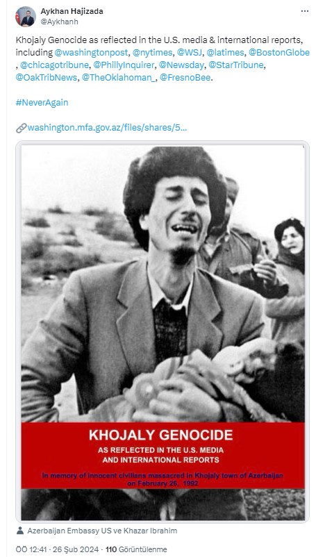 “İki sahil” xəbər verir ki, bu barədə Azərbaycan Xarici İşlər Nazirliyinin mətbuat katibi Ayxan Hacızadə Xocalı soyqırımının 32-ci ildönümü ilə bağlı "X" səhifəsindəki paylaşımında bildirib.
