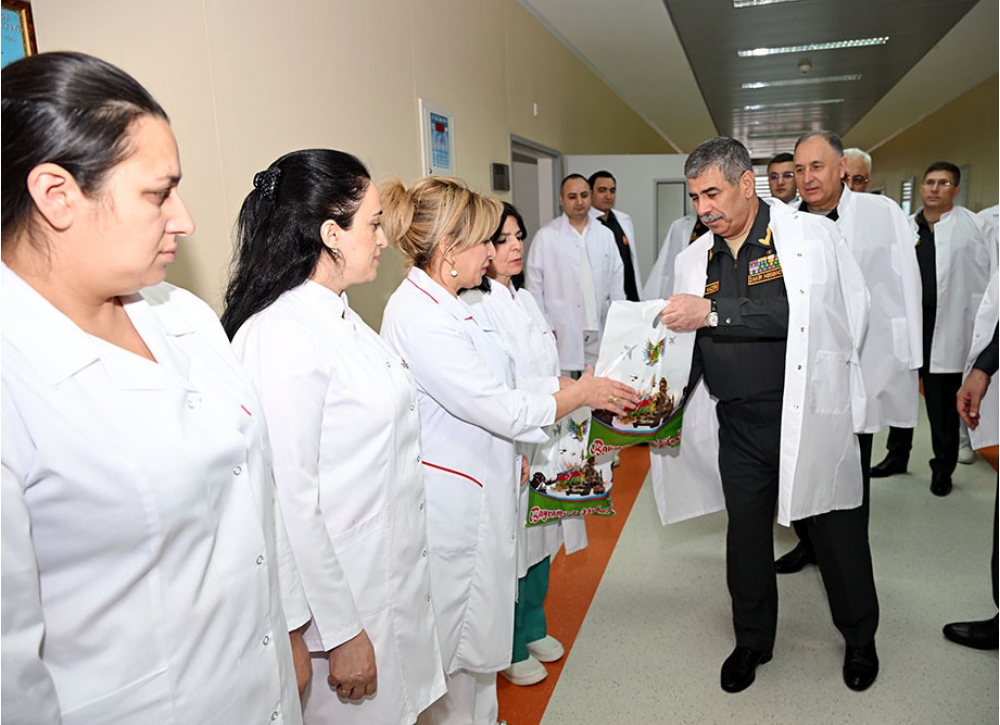 Tibb işçiləri ilə görüşən nazir onları da bayram münasibətilə təbrik edib, müayinə və müalicə olunan hərbi qulluqçulara daha keyfiyyətli xidmət göstərilməsi ilə bağlı müvafiq tapşırıqlar verib.