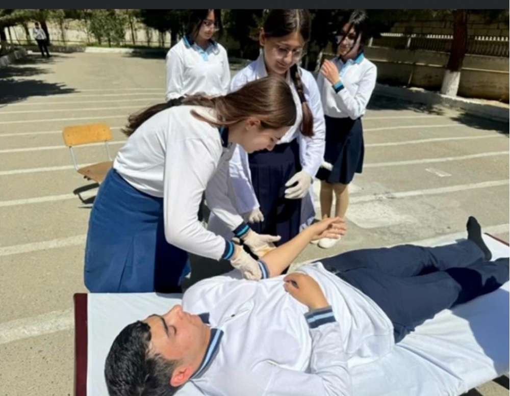 Tədbirin praktiki hissəsində baş vermiş şərti fövqəladə hadisə ilə əlaqədar məktəb kollektivinin təxliyəsi, odsöndürən balonla “yanğın mənbələrinin söndürülməsi” və digər əməliyyatlar icra olunub.
