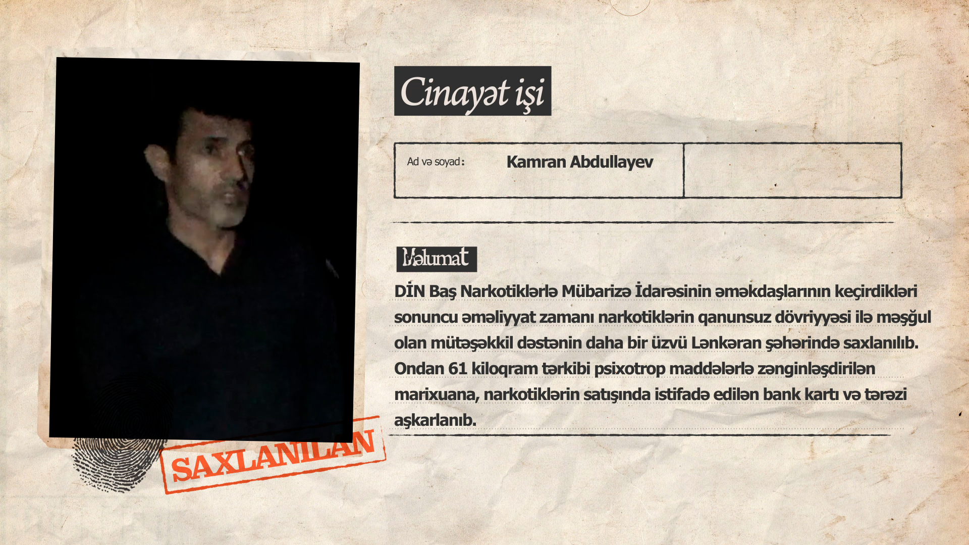 DİN Baş Narkotiklərlə Mübarizə İdarəsinin əməkdaşlarının keçirdikləri sonuncu əməliyyat zamanı narkotiklərin qanunsuz dövriyyəsi ilə məşğul olan mütəşəkkil dəstənin daha bir üzvü - əvvəllər məhkum olunmuş Kamran Abdullayev Lənkəran şəhərində saxlanılıb.
