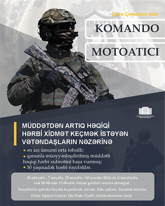 Azərbaycan Ordusunda “Motoatıcı” və “Komando” (Quru Qoşunları üzrə) ixtisasları üzrə müddətdən artıq həqiqi hərbi xidmətə könüllü daxil olmaq arzusunda olan vətəndaşların qəbuluna başlanılır.