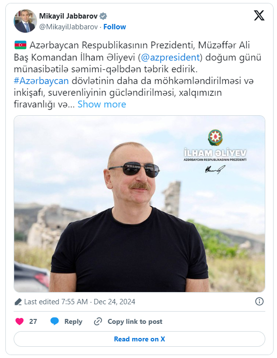 "Azərbaycan Respublikasının Prezidenti, Müzəffər Ali Baş Komandan İlham Əliyevi doğum günü münasibətilə səmimi-qəlbdən təbrik edirik".