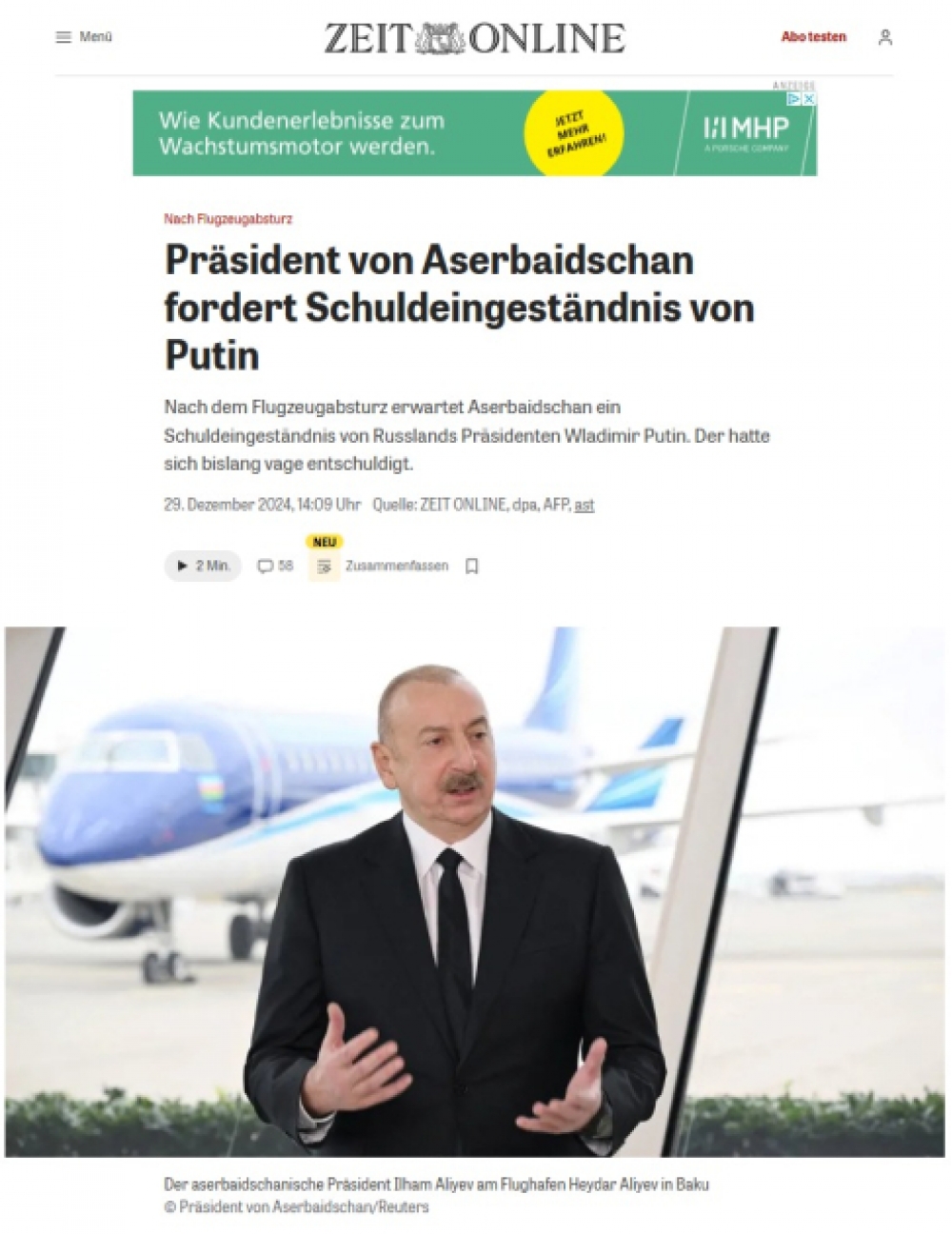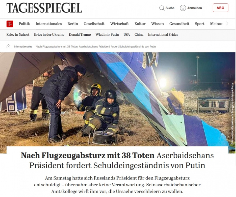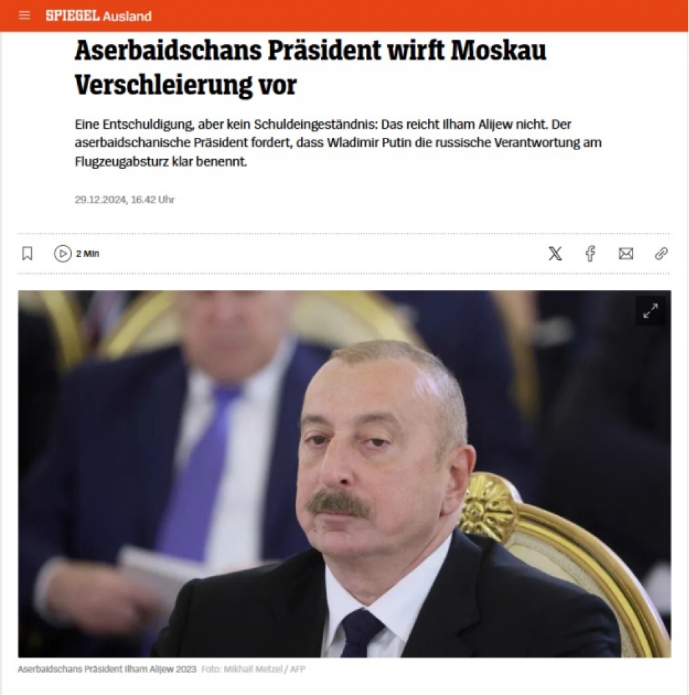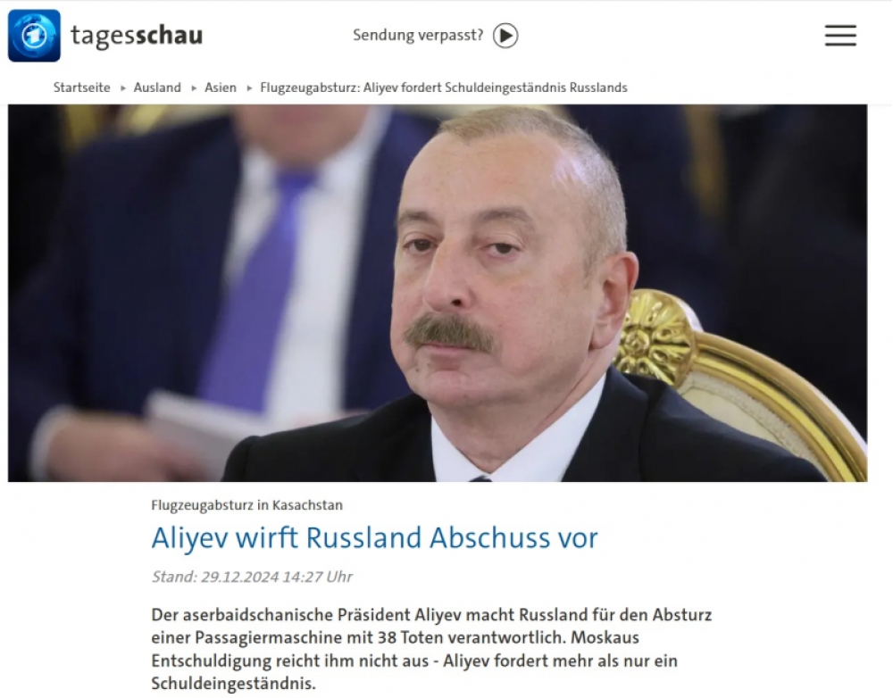“İki sahil” xəbər verir ki, “Bild”, “Spiegel”, “Zeit”, “Tagesspiegel” qəzetlərində, “Deutsche Welle”, “Welt”, “Tagesschau” televiziyalarında yayımlanan xəbərlərdə dövlətimizin başçısının sərnişin təyyarəsinin Rusiya ərazisində olarkən radioelektron mübarizə vasitələri tərəfindən idarəolunmaz vəziyyətə salındığını, yerdən açılan atəş nəticəsində quyruq hissəsinin böyük dərəcədə zədələndiyini qeyd etdiyi bildirilib. Eləcə də Prezident İlham Əliyevin hadisənin baş verməsindən sonrakı üç gün ərzində qəzanın səbəbləri ilə bağlı Rusiya tərəfindən cəfəng fikirlərin səsləndirilməsi və bununla da hadisənin əsl səbəbinin ört-basdır edilməsinə cəhd göstərilməsi barədə açıqlamaları xüsusi vurğulanıb. Xəbərlərdə dövlətimizin başçısının “Bizi təəssüfləndirən və təəccübləndirən məqamlardan biri də o idi ki, Rusiyanın rəsmi qurumları hansısa qaz balonunun partlaması ilə bağlı versiyalar irəli sürmüşdü. Yəni, bu, açıq-aydın göstərirdi ki, Rusiya tərəfi məsələni ört-basdır etmək istəyir və əlbəttə, bu, heç kimə başucalığı gətirmir”, - fikri sitat gətirlib.