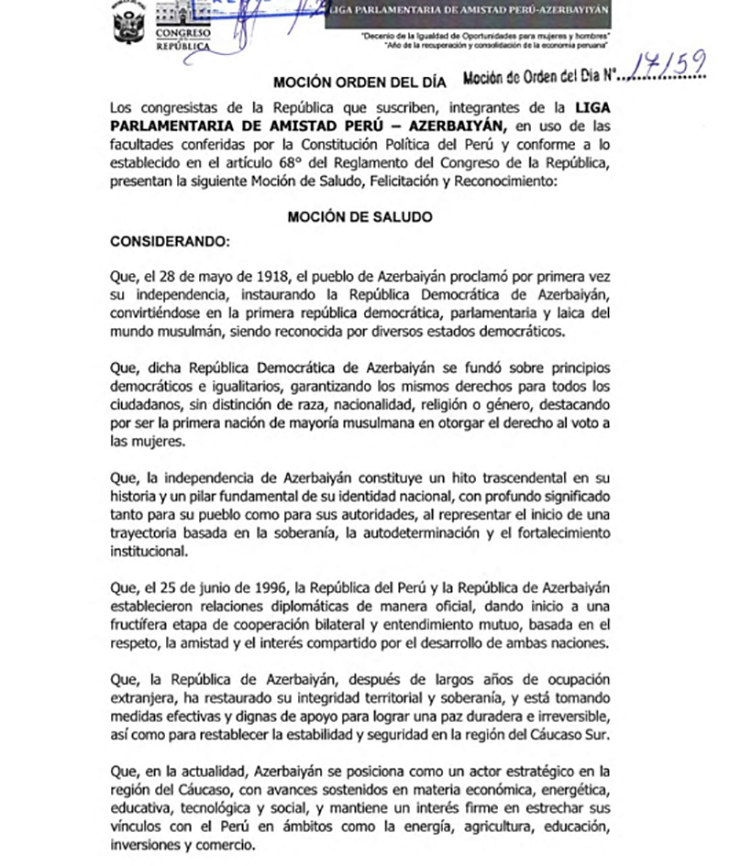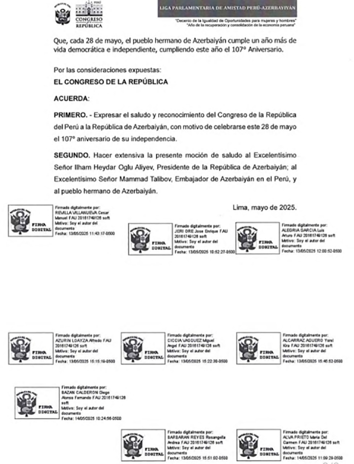 Peru Konqresi Azərbaycan Xalq Cümhuriyyətinin yaranmasının 107-ci ildönümü münasibətilə dünya azərbaycanlılarına təbriklə bağlı bəyanat qəbul edib.