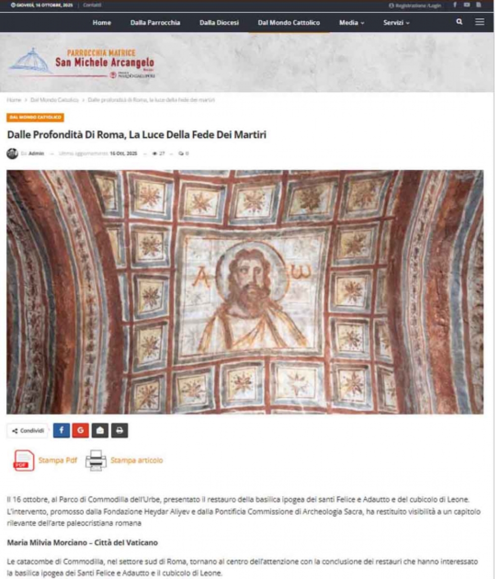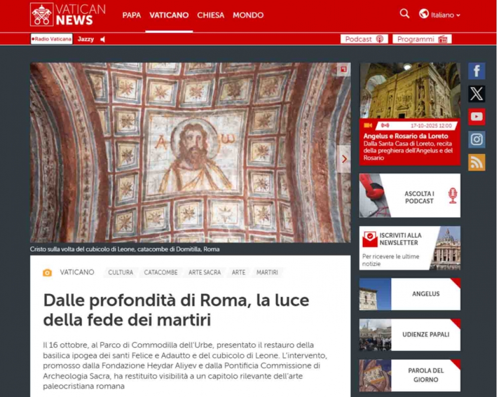 Müqəddəs Taxt-Tacın “Vatican News” portalının yaydığı materialda Heydər Əliyev Fondunun dəstəyi ilə həyata keçirilən layihənin katakombada mövcud olan Roma erkən xristianlıq dövrünə aid ilk artefaktları yenidən görməyə imkan yaratdığı qeyd olunur. Diqqətə çatdırılır ki, katakombaların yerləşdiyi məkan XVIII əsrdə aşkar olunub, ilkin tədqiqatlar 1900-cü ildən başlanıb. Katakomba Felisio və Adauktus adlı xristian əzabkeşlərinin dəfn olunduğu məkan kimi də tanınır və Orta əsrlərdə ziyarətgah olub. Katakombada ilk xristian əzabkeşi San Stefano, İsa peyğəmbərin həvari Pyotra Cənnətin açarlarını təqdim etməsi və digər mövzularda freskalar müstəsna dini və tarixi əhəmiyyət daşıyır.