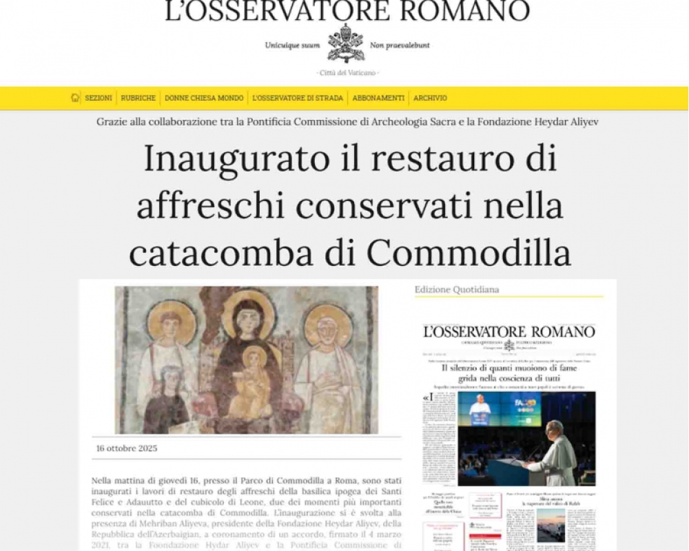 Müqəddəs Taxt-Tacın informasiya resursları Azərbaycanın Birinci vitse-prezidenti Mehriban Əliyevanın iştirakı ilə oktyabrın 16-da Müqəddəs Komodilya katakombalarının bərpası layihəsinin açılışını diqqətdə saxlayıb.