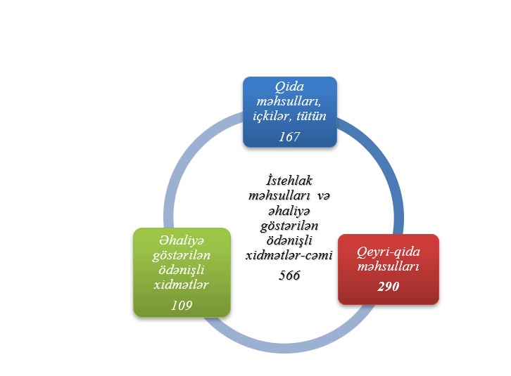 Hazırda qiymətlərin dəyişməsi üzrə aparılan statistik müşahidələrin əsasını təşkil edən istehlak səbəti 566 adda məhsul və xidmət növünü əhatə edir. Bu səbətə 167 adda ərzaq məhsulu, 290 adda qeyri-ərzaq məhsulu və 109 adda əhaliyə göstərilən ödənişli xidmət daxildir :