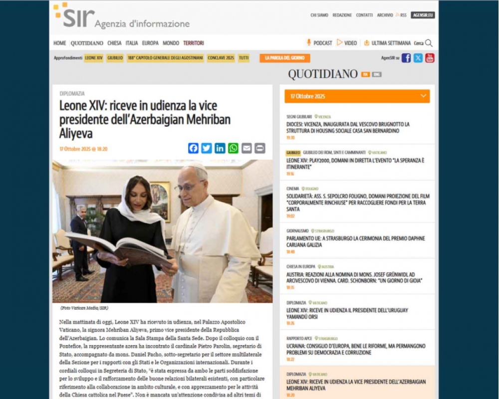 Müqəddəs Taxt-Tacın və İtaliyanın aparıcı mətbu orqanları Azərbaycanın Birinci vitse-prezidenti Mehriban Əliyevanın Vatikana rəsmi səfəri çərçivəsində oktyabrın 17-də Roma Papası XIV Leo ilə görüşünə geniş yer ayırıb.