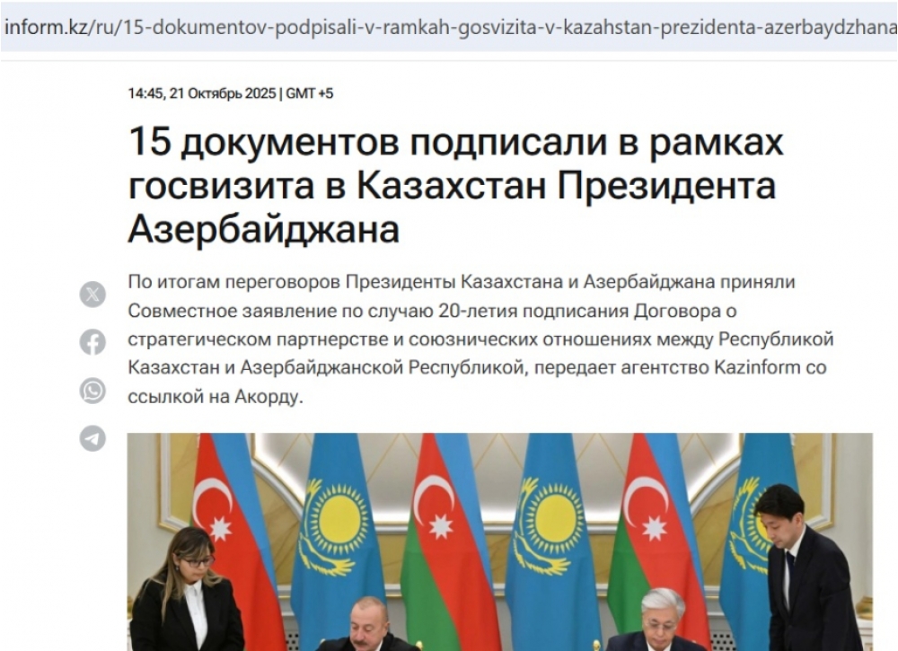 Beynəlxalq “Kazinform” informasiya agentliyi xəbər verir ki, Azərbaycan Prezidentinin Qazaxıstana dövlət səfəri çərçivəsində energetika, nəqliyyat-logistika, rəqəmsallaşma və süni intellekt, sənaye təhlükəsizliyi, səhiyyə, statistika, eləcə də mədəni-humanitar əlaqələr sahələrində əməkdaşlığa dair 15 sənəd imzalanıb.