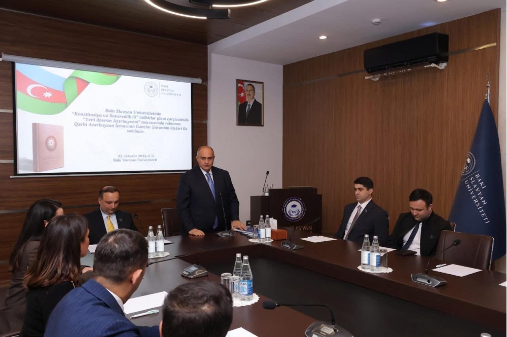 Oktyabrın 23-də Bakı Slavyan Universitetində (BSU) “Konstitusiya və Suverenlik İli” Tədbirlər Planı çərçivəsində BSU-nun Qərbi Azərbaycan İcmasının Gənclər Şurasının birgə təşkilatçılığı ilə universitetin rektoru Anar Nağıyevin “Yeni Dövrün Azərbaycanı, milli dövlət, suverenlik və yeni çağırışlar” mövzusunda seminarı keçirilib.