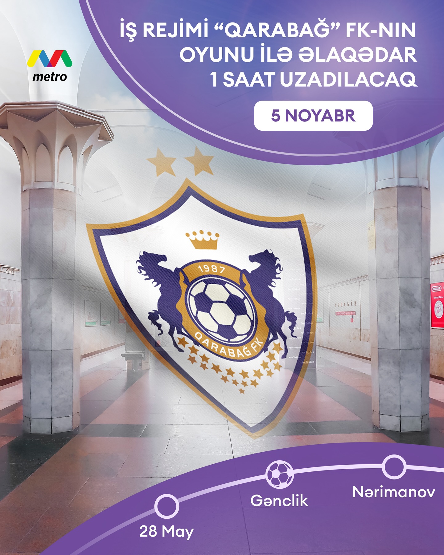 "Bakı Metropoliteni" QSC “Qarabağ” klubunun UEFA Çempionlar Liqası oyunu ilə əlaqədar uzadılmış iş rejimində çalışacaq.