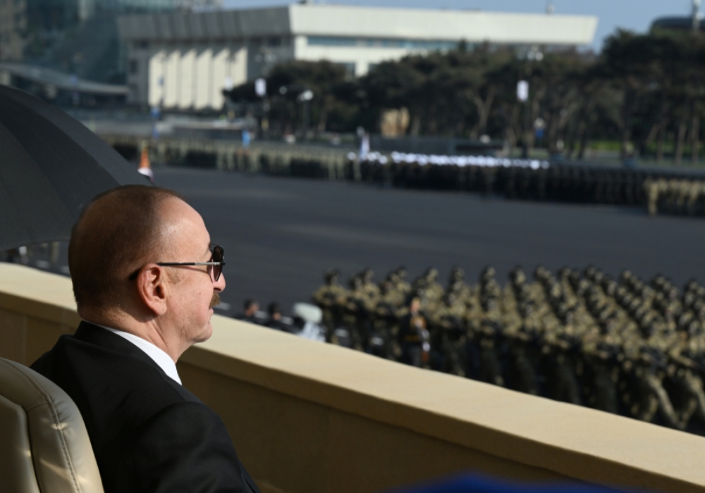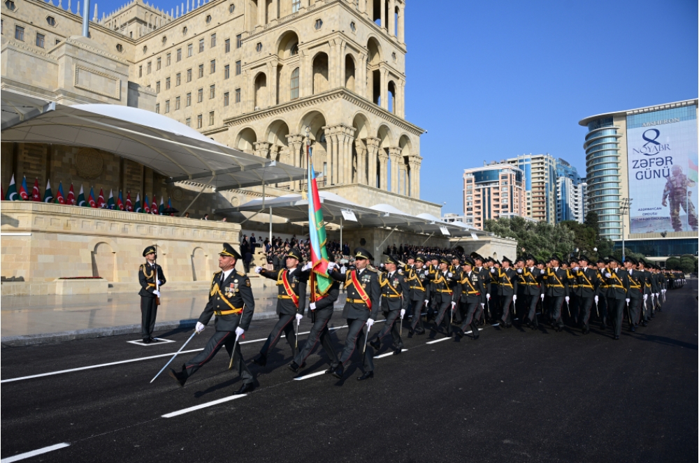 Silahlı Qüvvələrimizin şəxsi heyəti Azərbaycan Respublikasının Dövlət Bayrağı altında tribunaya doğru irəlilədi. Dövlət Bayrağının ardınca Azərbaycan Ordusunun və hərbi əməliyyatlarda xüsusilə fərqlənən birləşmələrin Döyüş bayraqları “Vətənə xidmətə görə” ordenli general-mayor Vüqar Əliverdiyevin başçılığı ilə Azadlıq meydanına gətirildi.