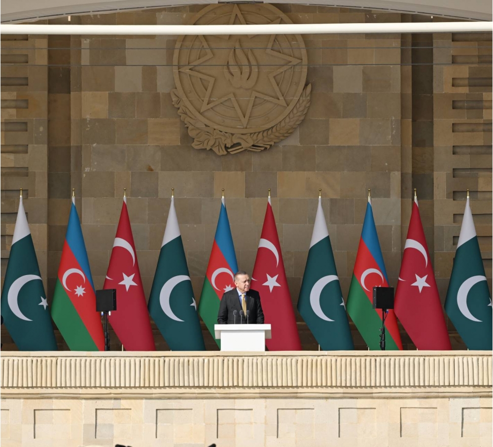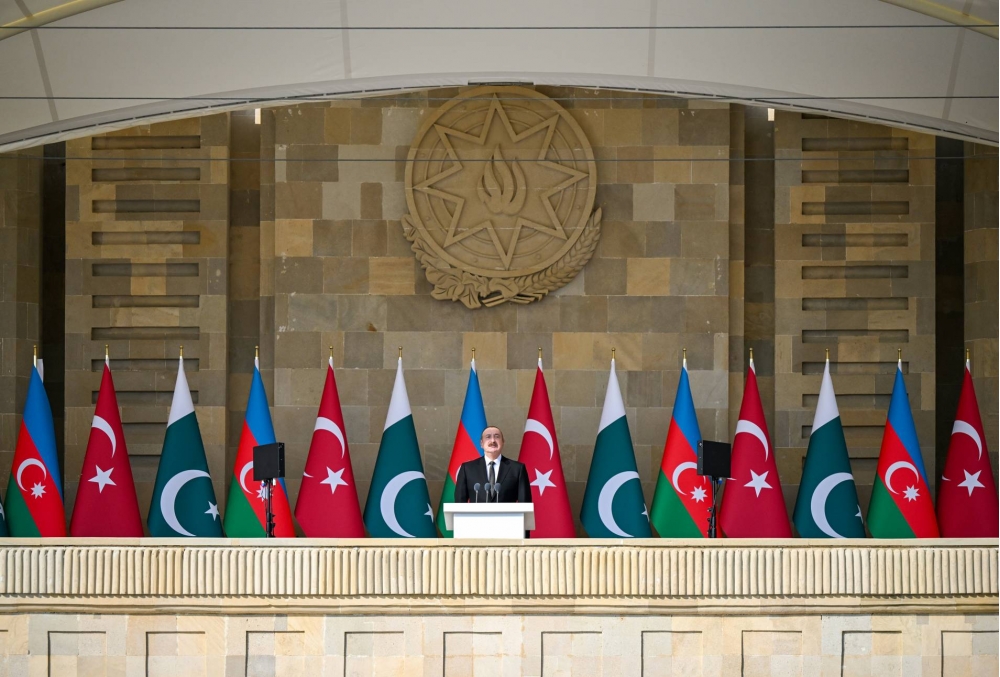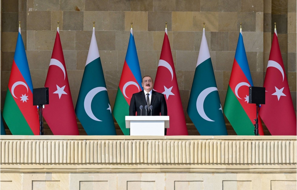 Beş il bundan əvvəl Zəfər paradında da əziz qardaşım Rəcəb Tayyib Ərdoğan bizimlə bərabər idi. Bu gün isə bizimlə bərabər digər əziz qardaşım iştirak edir. Qardaş Pakistanın Baş naziri Məhəmməd Şahbaz Şərif bizim qonağımızdır. Pakistan dövləti və xalqı 44 günlük Vətən müharibəsi zamanı Azərbaycana dəstək və həmrəylik göstərmişdir. Bu gün ilk dəfə olaraq Azadlıq meydanında Pakistan hərbçiləri də bizimlə bərabər iştirak edirlər. Bu, üç ölkənin - Azərbaycan, Türkiyə, Pakistan xalqlarının, ordularının birliyinin təzahürüdür.