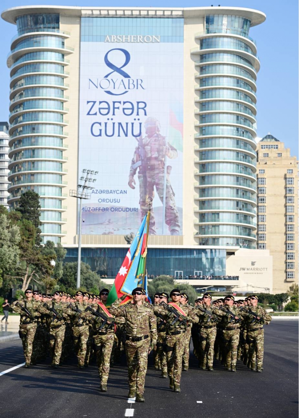 Silahlı Qüvvələrimizin şəxsi heyəti Azərbaycan Respublikasının Dövlət Bayrağı altında tribunaya doğru irəlilədi. Dövlət Bayrağının ardınca Azərbaycan Ordusunun və hərbi əməliyyatlarda xüsusilə fərqlənən birləşmələrin Döyüş bayraqları “Vətənə xidmətə görə” ordenli general-mayor Vüqar Əliverdiyevin başçılığı ilə Azadlıq meydanına gətirildi.
