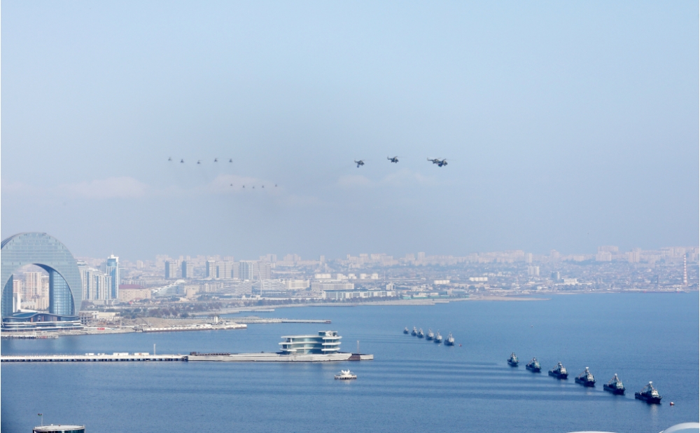 Ardınca Hərbi Dəniz Qüvvələrinin və Dövlət Sərhəd Xidməti Sahil Mühafizəsinin döyüş gəmiləri və katerləri Hərbi parad üçün Xəzər dənizinin sahil sularında yüksək döyüş hazırlığı nümayiş etdirdi.