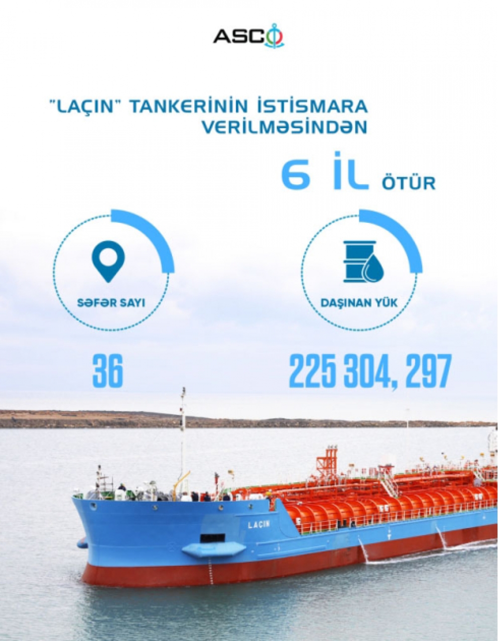 Azərbaycanın ilk milli tankeri “Laçın”ın istismara verilməsindən 6 il ötür. Azərbaycan Xəzər Dəniz Gəmiçiliyinin (ASCO) sifarişi ilə Bakı Gəmiqayırma Zavodunda inşa olunan tankerin istismara verilməsi mərasimi 2019-cu ilin 13 dekabrında Prezident İlham Əliyevin iştirakı ilə baş tutub.