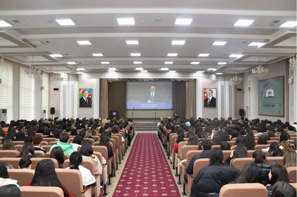 Çıxışda Ulu Öndər Heydər Əliyevin ana dilinin qorunması və inkişafı istiqamətində ardığı tarixi addımlar, eləcə də Prezident İlham Əliyevin Azərbaycan dilinin saflığının qorunması ilə bağlı çağırışları xüsusi vurğulanıb. A.Nağıyev bildirib ki, 2012-ci ildə Bişkekdə keçirilmiş Türk Dövlətləri Təşkilatının Zirvə Toplantısında yaradılan Türk Dövlətləri Universitetlər Birliyi və “Orhun” Mübadilə Proqramı elm və təhsil sahəsində əməkdaşlığı təşviq edir, BSU isə 2024-cü ildən etibarən Türk Dövlətləri Universitetlər Birliyinin üzvüdür. Rektor qeyd edib ki, BSU-da fəaliyyət göstərən Türk Araşdırmaları Mərkəzində, həmçinin Türkologiya və Balkanşünaslıq kafedralarında türk dilinin öyrənilməsi, türkoloji tədqiqatların aparılması universitetin mühüm əsaslardan birini təşkil edir. A.Nağıyev bildirib ki, BSU-da türk dilləri qrupundan Azərbaycan dili ilə yanaşı, Türk dili və ədəbiyyatı, Regionşünaslıq (Balkan, Mərkəzi Asiya ölkələri və Türkiyə üzrə) ixtisaslarında tədris olunur.