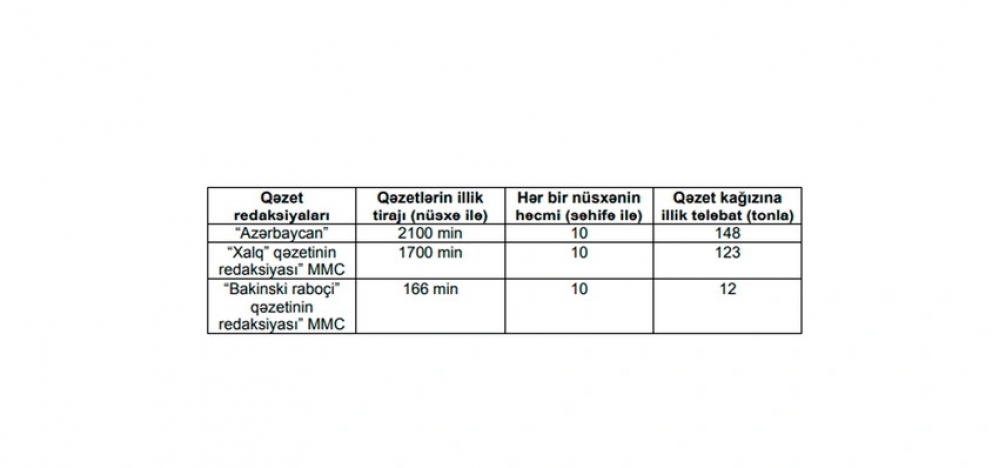 Qərara əsasən, dövlət sifarişlərinin yerinə yetirilməsi üçün "Azərbaycan" qəzeti redaksiyasına, "Xalq" qəzetinin redaksiyası" Məhdud Məsuliyyətli Cəmiyyətinə və "Bakinski raboçi" qəzetinin redaksiyası" Məhdud Məsuliyyətli Cəmiyyətinə dövlət büdcəsinin vəsaiti hesabına alınacaq qəzet kağızının norması aşağıdakı kimidir:
