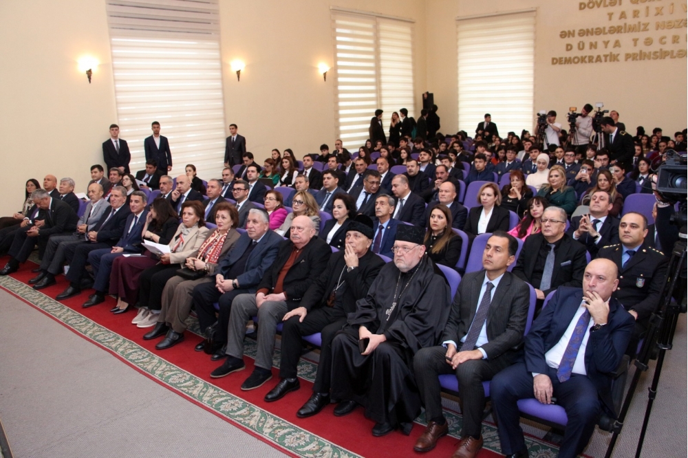 Azərbaycan Respublikasının Milli Məclisinin deputatlarının, ali təhsil müəssisələrinin, etnik və dini icmaların rəhbərlərinin, ictimaiyyət nümayəndələrinin, müxtəlif universitetlərin tələbələrinin iştirak etdiyi tədbir Azərbaycan Respublikasının Dövlət Himninin səsləndirilməsi ilə başlayıb.