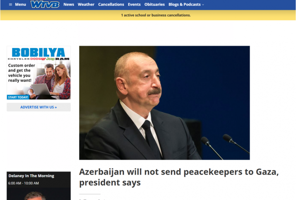 Beynəlxalq iqtisadiyyat portalı “İnvesting.com”, İsrailin “The Jerusalem Post”, “Israelhayom”, “Time of Israel” qəzetləri, rus dilində nəşr olunan “Vesti İzrail” portalı, Bolqarıstanın “Dnevnik” nəşri, Yunanstanın “Skai” internet resursu da Azərbaycan Prezidentinin Yaxın Şərqdə münaqişələrə dair fikirlərini dərc edib. Materiallarda qeyd olunub ki, Prezident İlham Əliyev Qəzza zolağına sülhməramlıların göndərilməsi ilə bağlı yayılan yanlış məlumatları təkzib edib və bu xəbərlərin ilk mənbəyi olan ABŞ tərəfinə diplomatik kanallarla 20 sualdan ibarət müraciət çatdırdığını, həmçinin bununla bağlı təəssüfləndiyini bildirib.