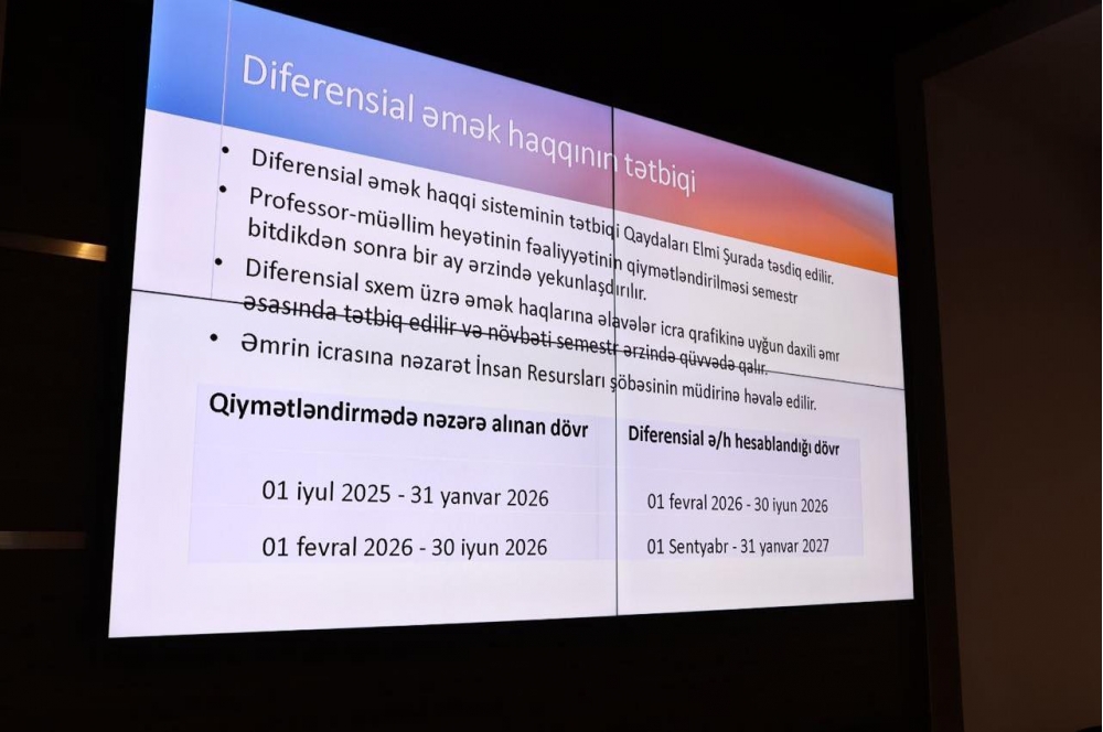 Universitetdən “İki sahil”ə verilən məlumata görə, iclasda BSU-da əmək nəticələrinə görə ədalətli ödənişi təmin etmək, professor-müəllim heyətinin motivasiyasını artırmaq, bacarıq fərqlərini nəzərə almaq, əmək məhsuldarlığını yüksəltmək, müəssisənin rəqabət qabiliyyətini artırmaq məqsədilə differensial əmək haqqının tətbiqi üzrə qaydalar hazırlanıb. Qeyd olunub ki, differensial əməkhaqqı sisteminin tətbiqi 3 hissədən ibarət bir proses olacaq və prosesin birinci mərhələsi (professor-müəllim heyəti üçün) 1 fevral 2026-cı ildən etibarən tətbiq olunmağa başlayacaq.