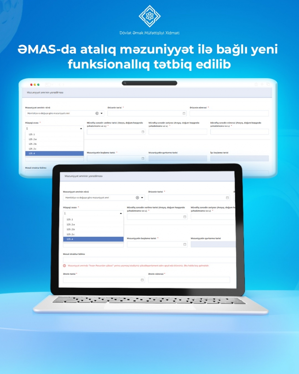 Əmək və Əhalinin Sosial Müdafiəsi Nazirliyinin “Əmək və Məşğulluq” altsistemində (ƏMAS) uşağının doğulması ilə əlaqədar kişilərə ödənişli məzuniyyət verilməsi ilə bağlı əmri e-qaydada formalaşdırmaq üçün yeni funksionallıq tətbiq edilib.