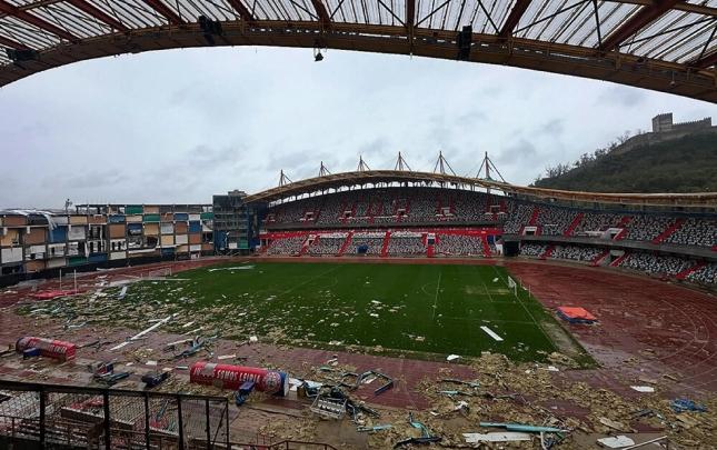 Güclü külək nəticəsində stadionun ətraf konstruksiyalarının bir hissəsi dağılıb, ən ciddi ziyan isə onun damına dəyib.