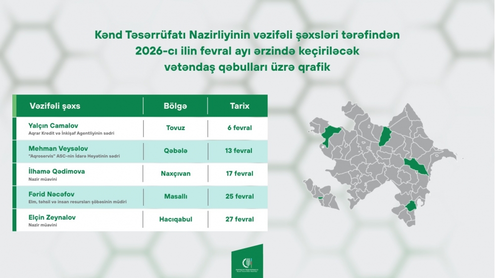 Kənd Təsərrüfatı Nazirliyinin vəzifəli şəxsləri tərəfindən 2026-cı ilin fevral ayı ərzində keçiriləcək vətəndaş qəbulları üzrə qrafiki təqdim edirik.