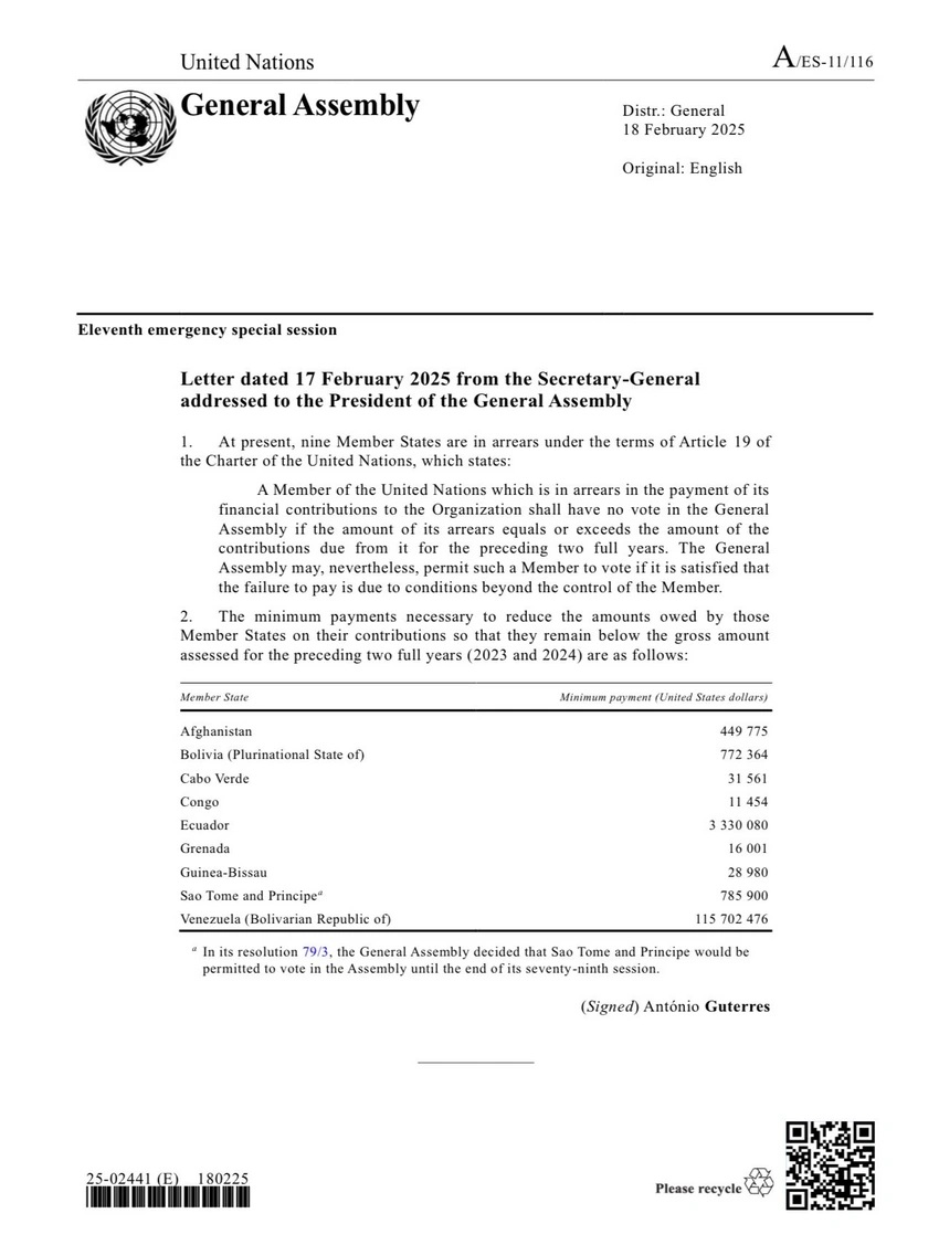 Məktubda qeyd olunur ki, hazırda 9 üzv dövlət 19-cu maddə çərçivəsində borclu sayılır. Həmin ölkələr borclarını son iki ilin ümumi ödəniş məbləğindən aşağı səviyyəyə endirmək üçün minimum ödəniş etməlidirlər. Siyahıda Əfqanıstan, Boliviya, Kabo-Verde, Konqo, Ekvador, Qrenada, Qvineya-Bisau, San-Tome və Prinsipi, Venesuela (Bolivar Respublikası). Sənədə əsasən, Venesuelanın borcunu tələb olunan həddən aşağı salmaq üçün etməli olduğu minimum ödəniş 115 702 476 ABŞ dollarıdır. Qeyd olunur ki, San-Tome və Prinsipi ilə bağlı Baş Assambleya ayrıca qərarla müəyyən müddətə səsvermə hüququnun saxlanmasına icazə verib, lakin Venesuela ilə bağlı belə istisna göstərilmir.