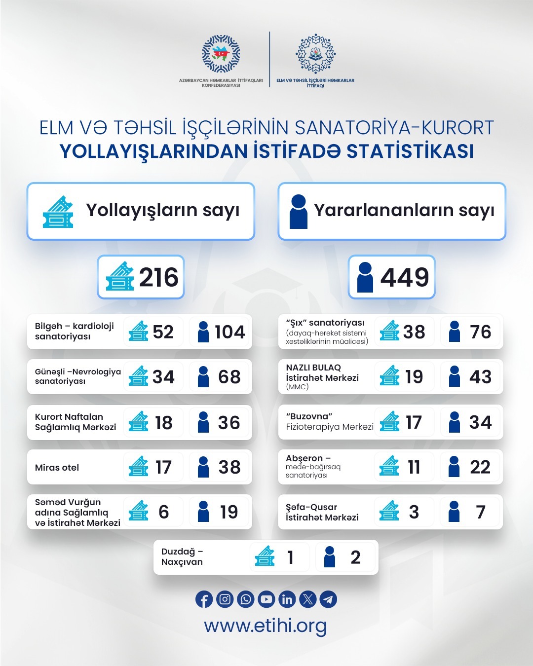 Azərbaycan Həmkarlar İttifaqları Konfederasiyasının üzv təşkilatı Elm və Təhsil İşçiləri Həmkarlar İttifaqı Respublika Komitəsi (ETİHİ) tərəfindən yanvar ayı ərzində ittifaq üzvləri üçün sanatoriya və müalicə mərkəzlərinə yollayışlardan istifadə imkanı yaradılıb.
