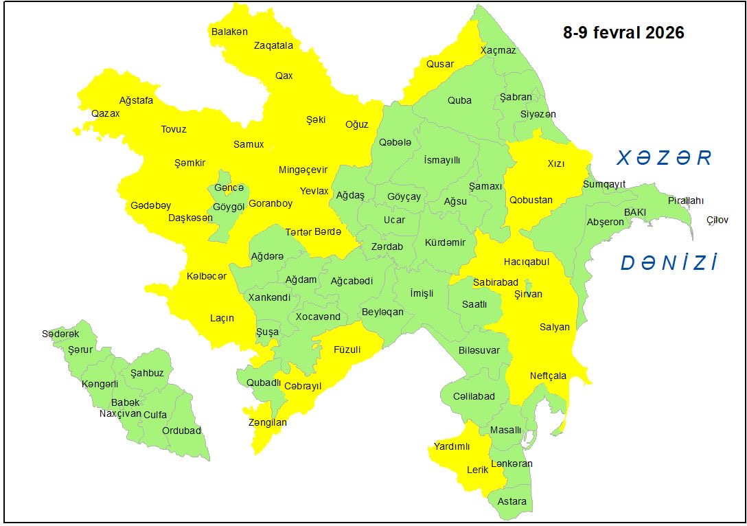 Milli Hidrometeorologiya Xidməti (MHX) fevralın 8-9-da bəzi bölgələrdə gözlənilən küləkli hava şəraiti ilə bağlı sarı xəbərdarlıq verib.